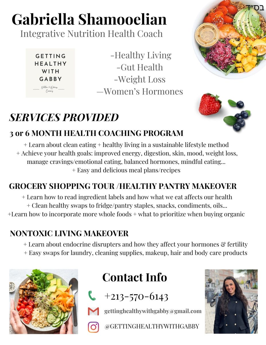 In honor of Channukah, I am offering a limited number of free zoom 50 minute one-on-one personalized health coaching consultations for girls and women who are looking to address their health goals. Please text me at 213-570-6143 or email gettinghealthywithgabby@gmail.com to schedule your consult.