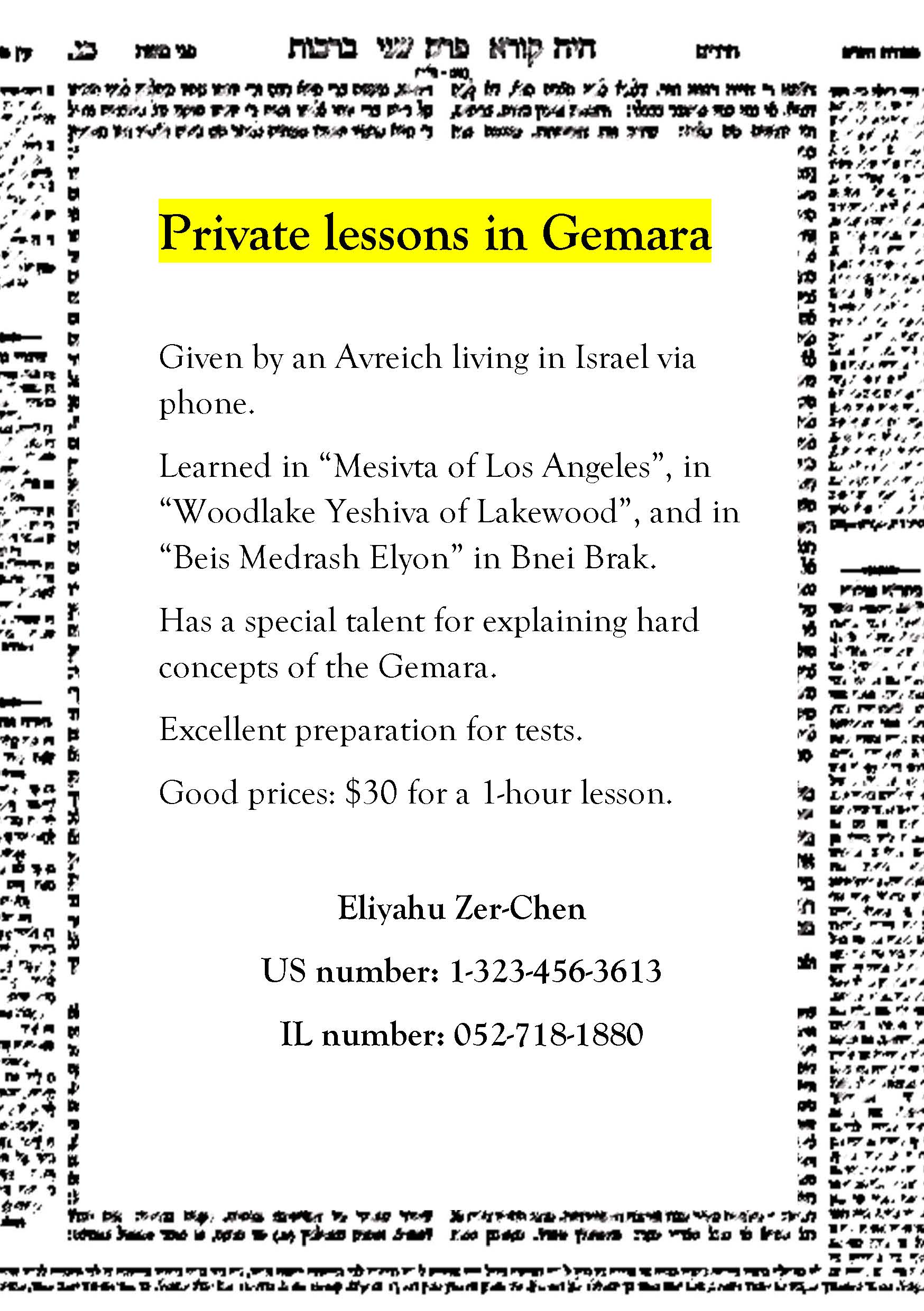 Private Lessons in Gemara via phone from Israel Eliyahu Zer-Chen
